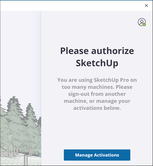 The Trimble Account Management Portal can help you manage what devices you have authorized for your SketchUp account. The SketchUp End User License Agreement (EULA) limits the amount of installations and authorizations for each application included in your subscription to two instances or devices. If you try to install and authorize an application on a third device or open a third instance of an application, you'll see the following message: